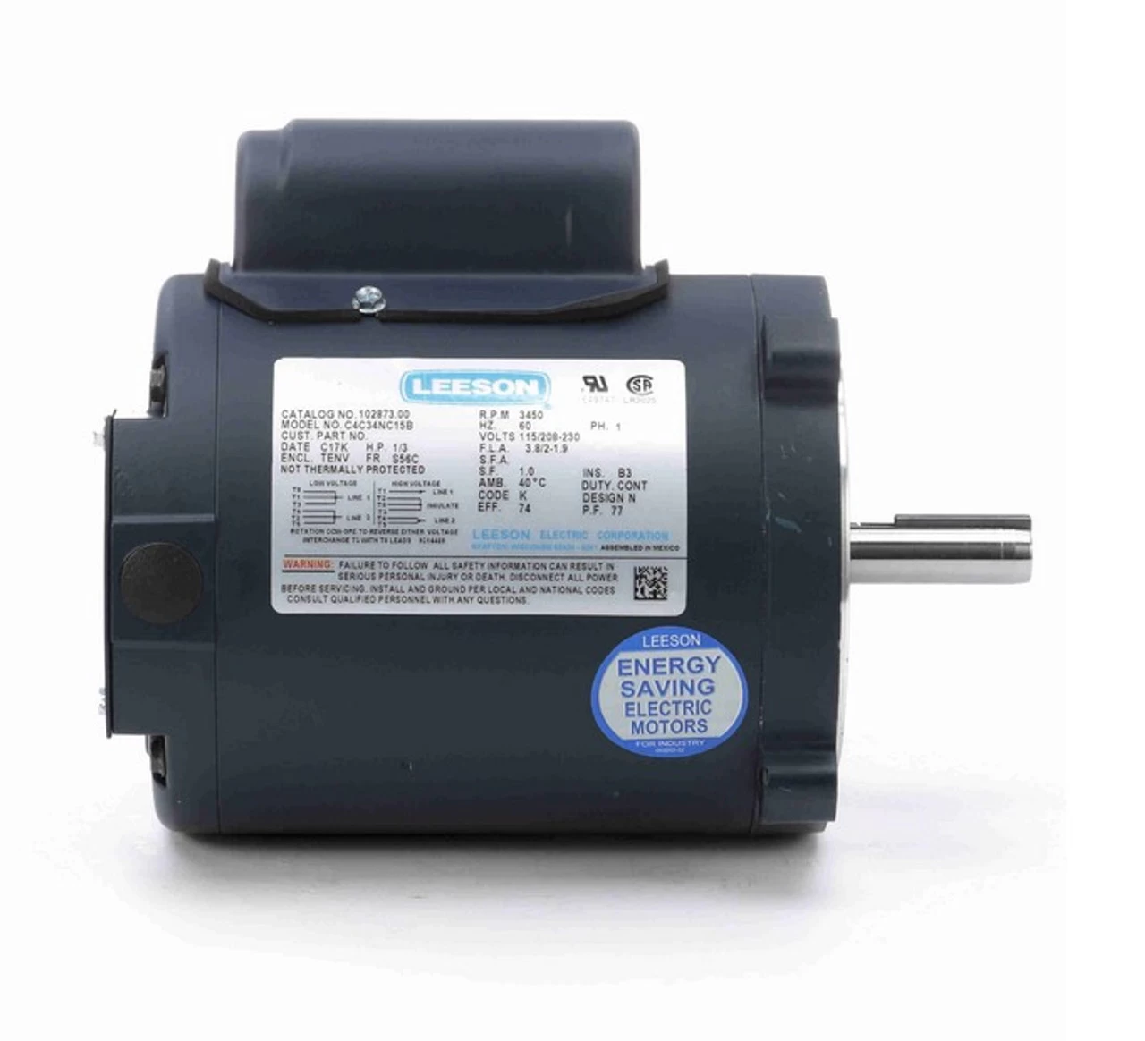 - 1/3 hp 3600 RPM, 3.8/2.0-1.9 amps, 115/208-230 Volts 60 Hz, Capacitor Start