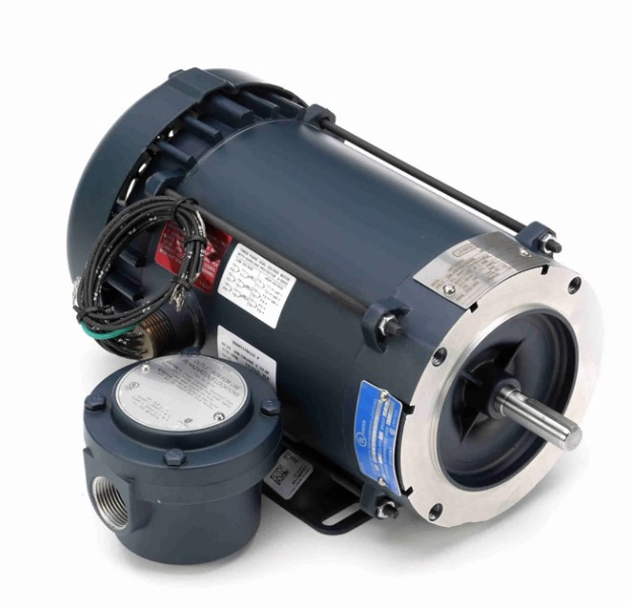 Explosion-Proof motor for use in hazardous environments with a C-face mount. DIV 1 EXP PROOF CL I GR CD CL II GR FG T3C. Bolt holes are 3 3/4″ on center measured across the shaft. Wiring diagram on motor name plate. TEFC = Totally Enclosed Fan-Cooled. 114630.00