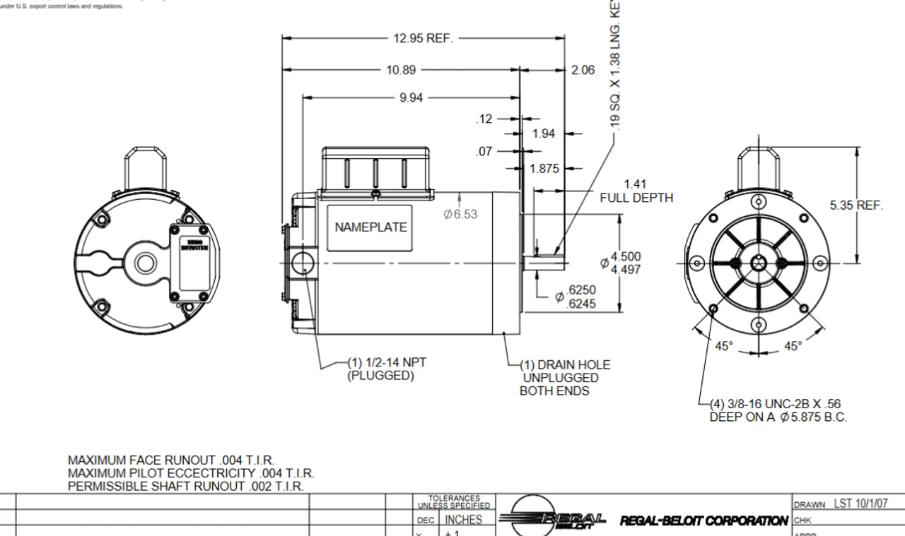 Stainless Steel wash-down motors are use in applications involving challenging caustic environments. Shaft has keyway. Motor has 4 threaded bolt holes on face for mounting a pump or gear head to the motor. Bolt holes are 5 7/8″ on center measured across the shaft. Wiring diagram on motor name plate. TENV = Totally Enclosed Non-Ventilated. 119524.00
