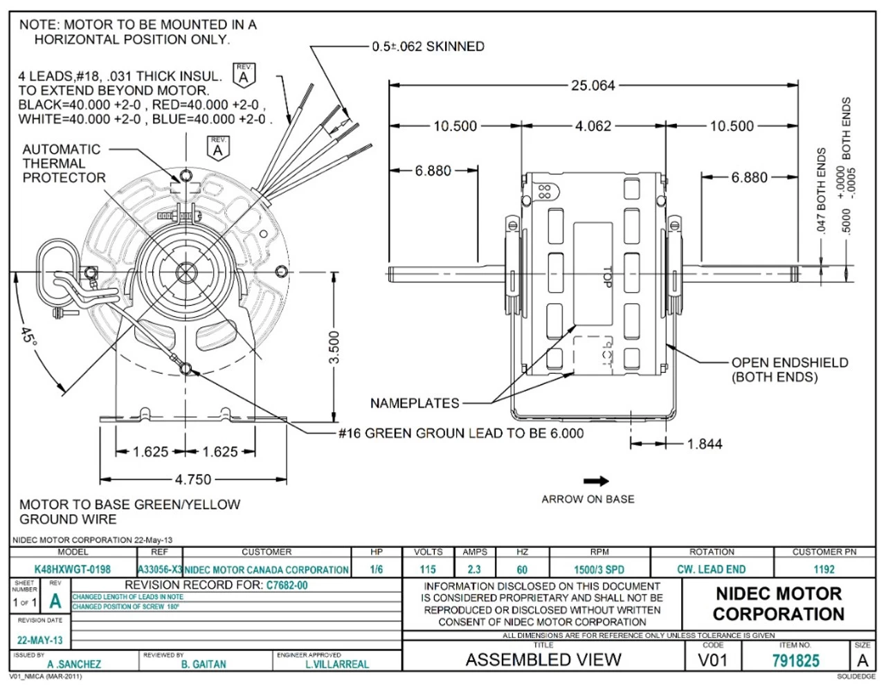 Permanent Split Capacitor Motor. Automatic Overload Protection. Continuous Duty; Open Enclosure; Class B Insulation; 40C Ambient Temperature; 40″ Leads. Application: Direct drive blower. K048WGT0198013B. Suggested after market replacement for IEC unit motors: 955
