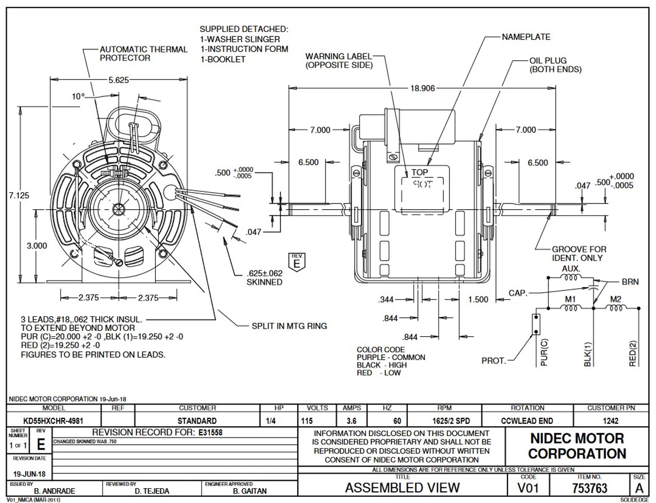 Permanent Split Capacitor Motor. Automatic Overload Protection. Continuous Duty; Open Drip Proof Enclosure; Class B Insulation; 40C Ambient Temperature; 24″ Leads, 60 Hertz. KA55SGR9929801B.
