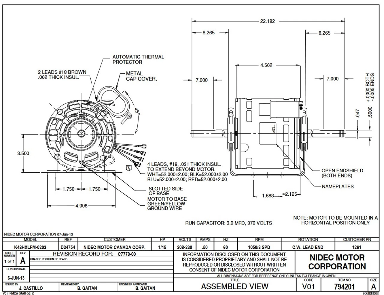 PSC Motor. Automatic Overload Protection. Continuous Duty; Open Enclosure; Class B Insulation; 40C Ambient Temperature; 52″ Leads. Includes Resilient Base and Mounted Capacitor. MOTOR TO BE MOUNTED IN A HORIZONTAL POSITION ONLY. K048LFM0203013B
