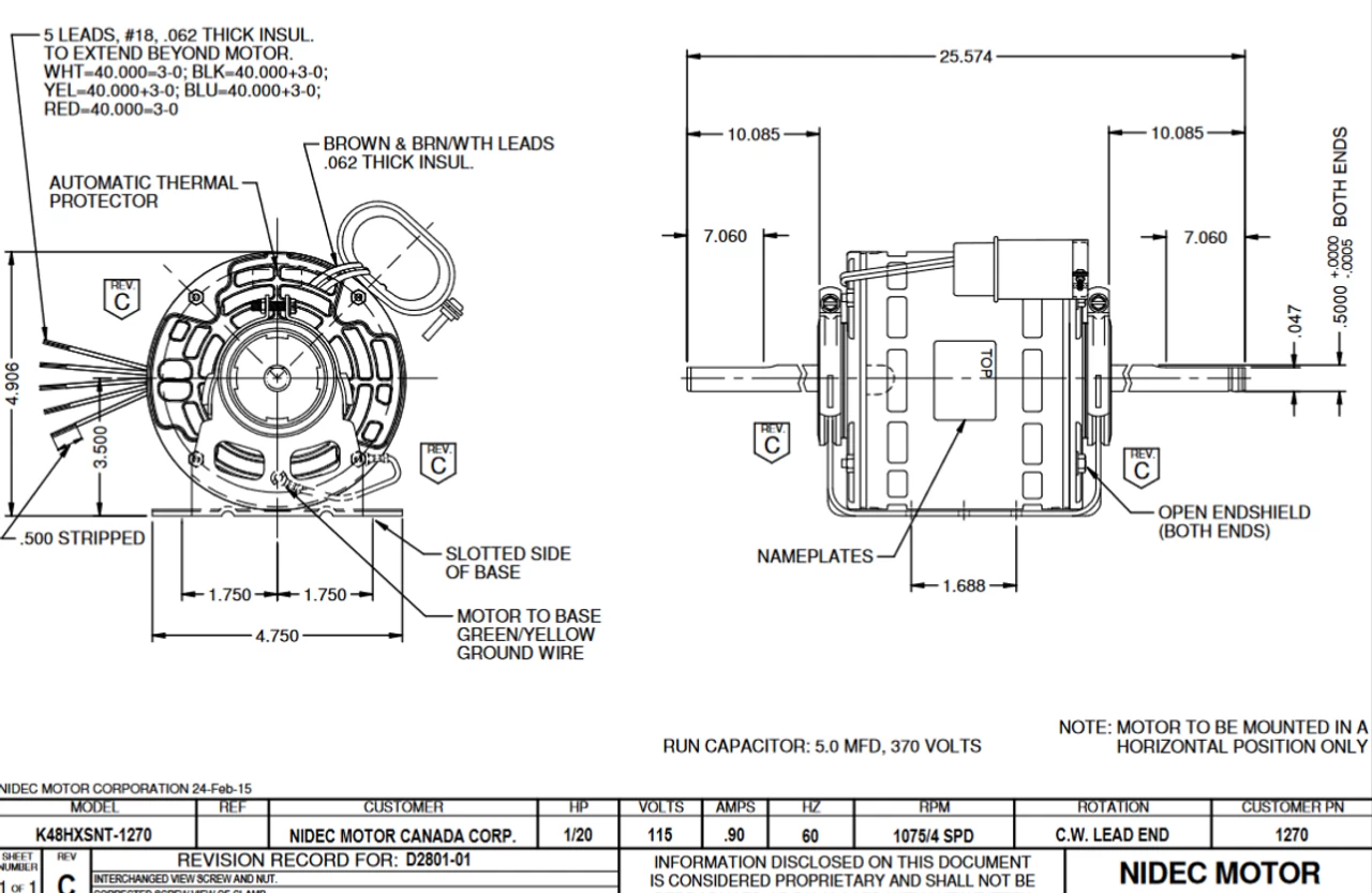 - 1/20 hp 1075 RPM, 4 speed, 0.86 amps 115V Volts 60 Hz PSC Motor
