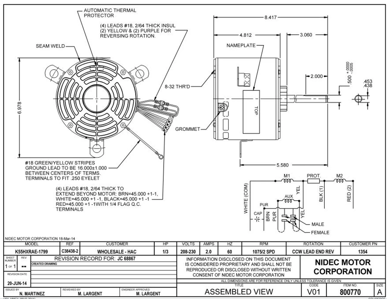 Permanent Split Capacitor Motor. Automatic Overload Protection. Continuous Duty; Open Enclosure; Class B Insulation; 40C Ambient Temperature; 40″ Leads, 50/60 Hertz. Refrigeration condenser motor, K055RAE1799012B