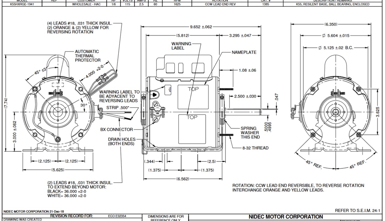 - 1/6 hp 1625 RPM (1 speed), 2.5 amps 230V Volts 60 Hz PSC Motor