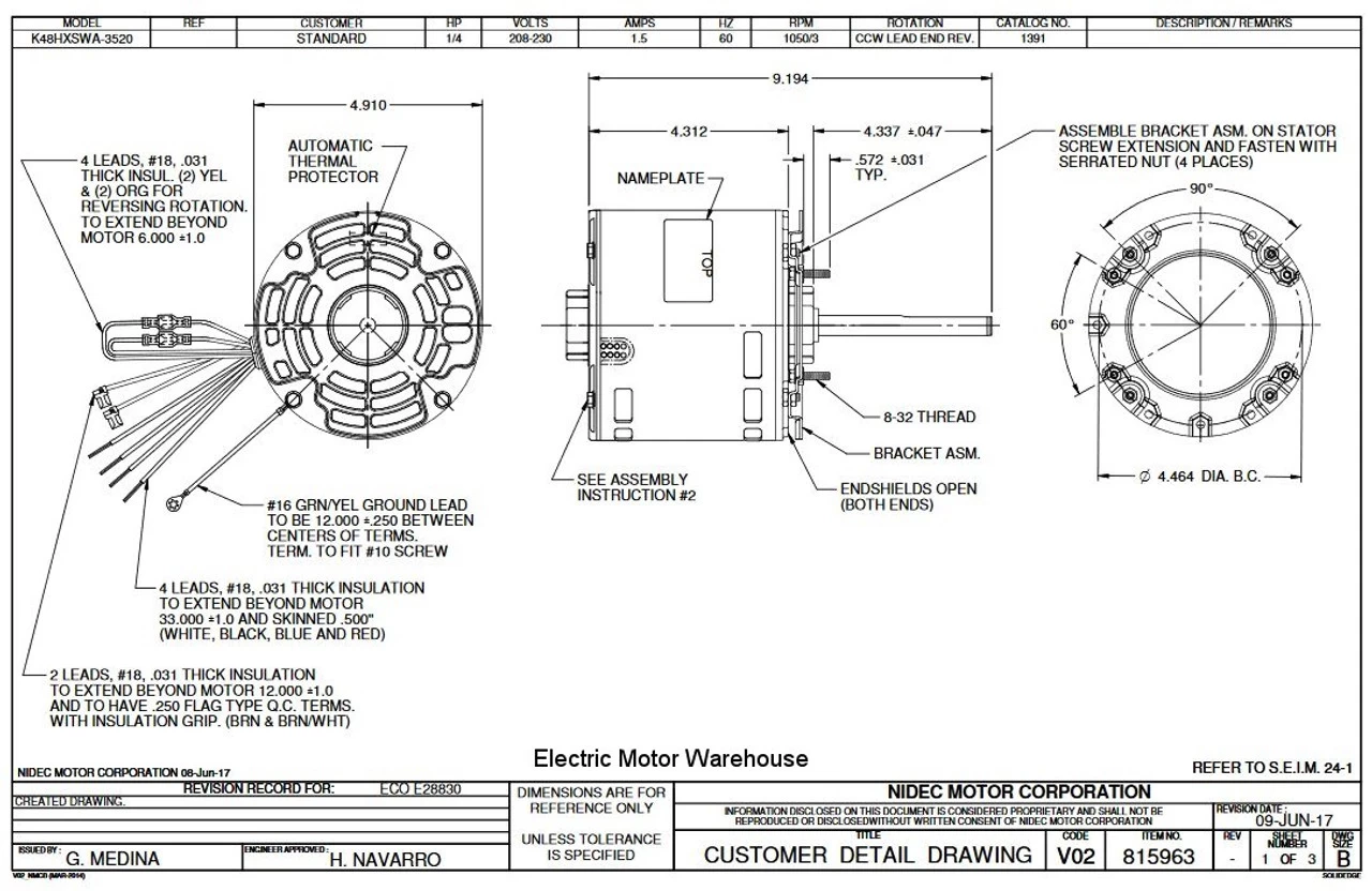 Permanent Split Capacitor Motor. Automatic Overload Protection. Continuous Duty; Open Drip Proof Enclosure; Class B Insulation; 40C Ambient Temperature; 8″ Leads. Application: Heat Pump, Furnace. K048SWA3520012B. COLEMAN, ARVIN, BOHN, DELTA THERM, FRIEDRICH 391, D151, A6262, 5002-M, 3400A312