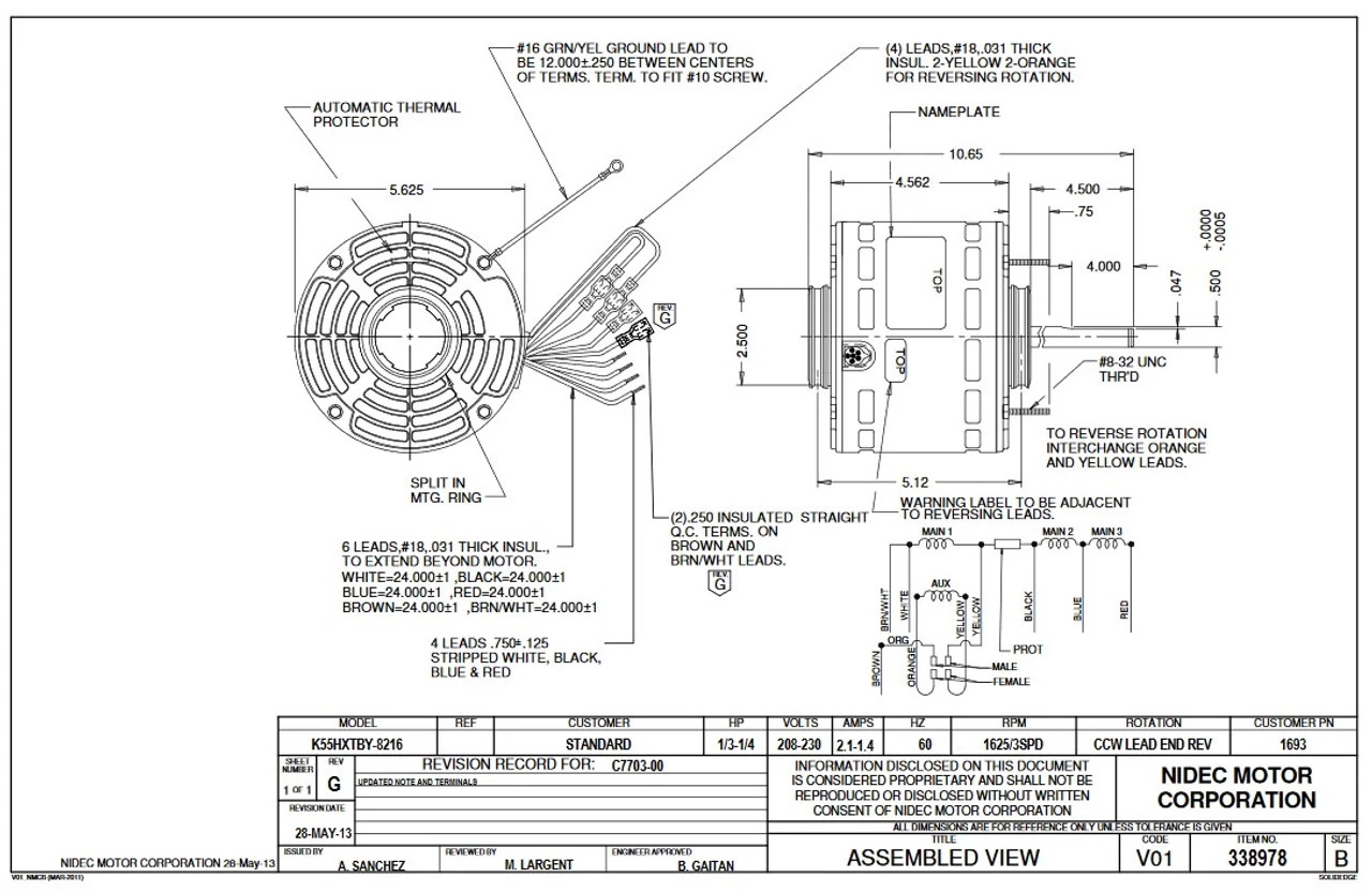 Permanent Split Capacitor Motor. Automatic Overload Protection. Continuous Duty; Open Air Over Enclosure; Class B Insulation; 40C Ambient Temperature; 24″ Leads, 60 Hertz. K055TBY8216012B
