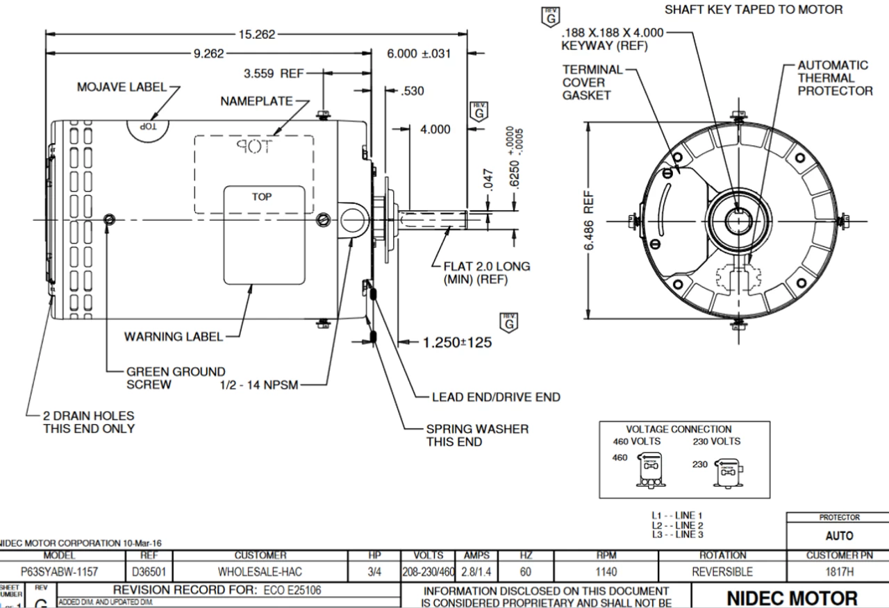 - 3/4 hp 1140 RPM, 2.8/1.4 amps 208-230/460V Volts 60 Hz 3-Phase Motor