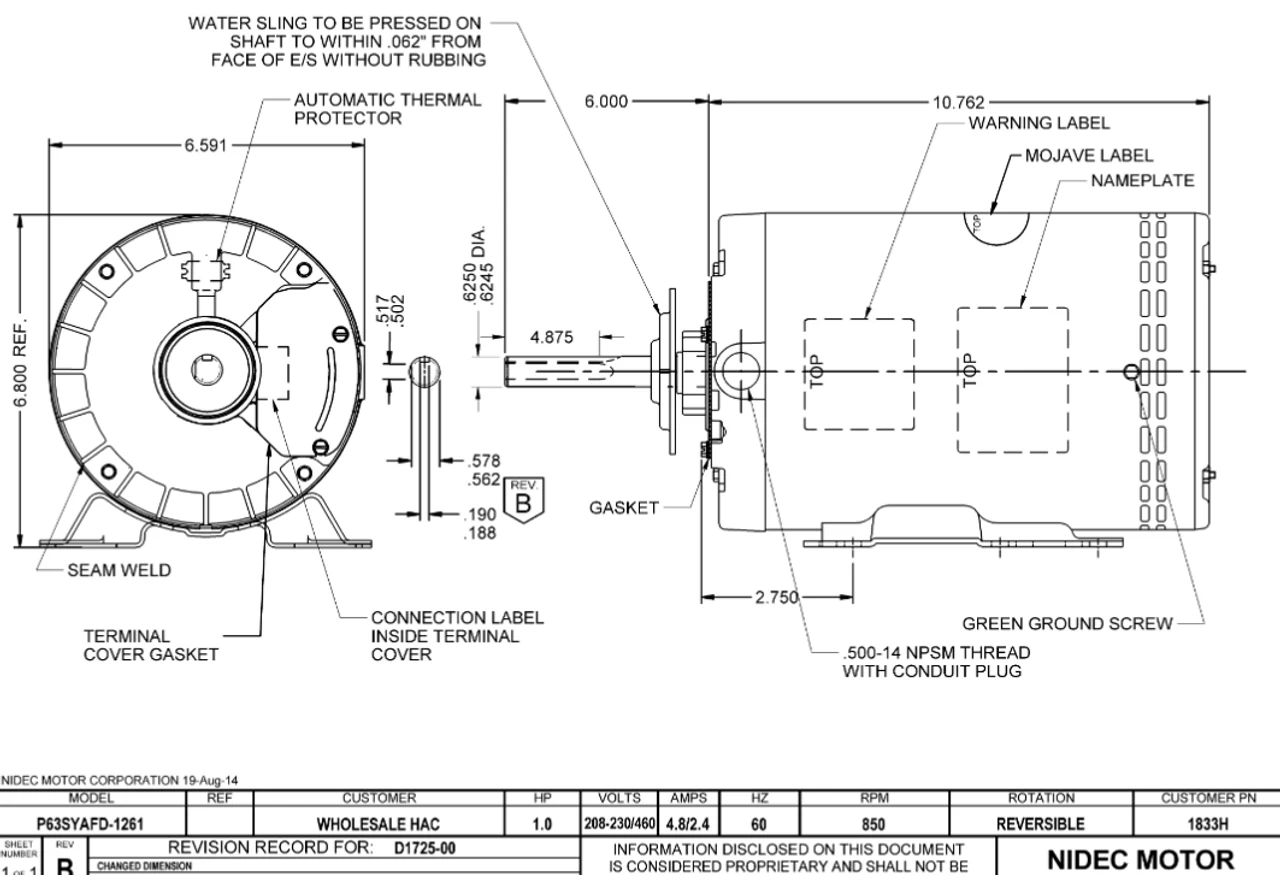 Commercial Condenser Fan Motor for higher than normal temperature environments. Wiring diagram on motor name plate. OAO = Open Air-Over, P063AFD1261015B