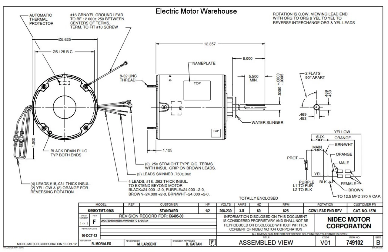 Permanent Split Capacitor Motor. Automatic Overload Protection. Continuous Duty; Totally Enclosed Air Over Enclosure; Class B Insulation; 60C Ambient Temperature; 30″ Leads, K055TMT9568862B