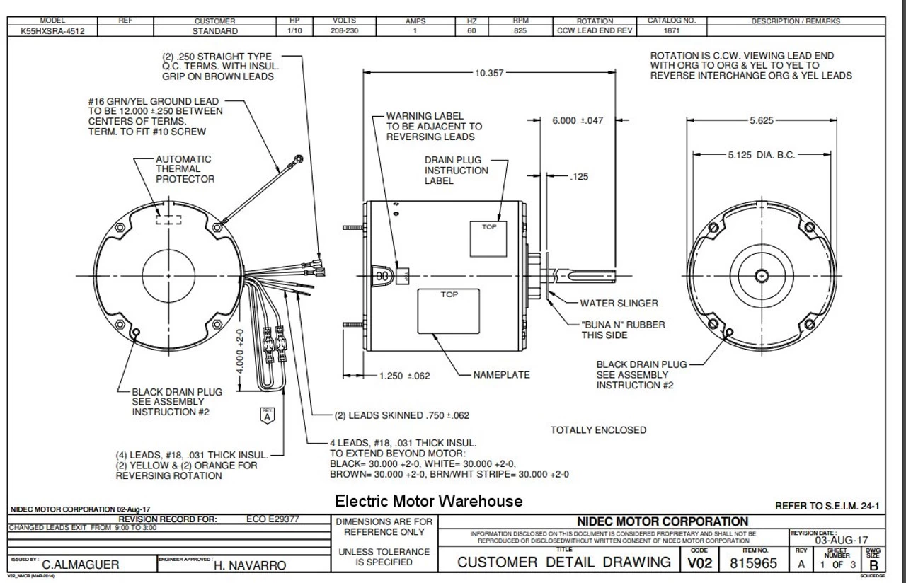 Permanent Split Capacitor Motor. Automatic Overload Protection. Continuous Duty; Totally Enclosed Air Over Enclosure; Class B Insulation; 60C Ambient Temperature; 36″ Leads, K055SRA4512862B