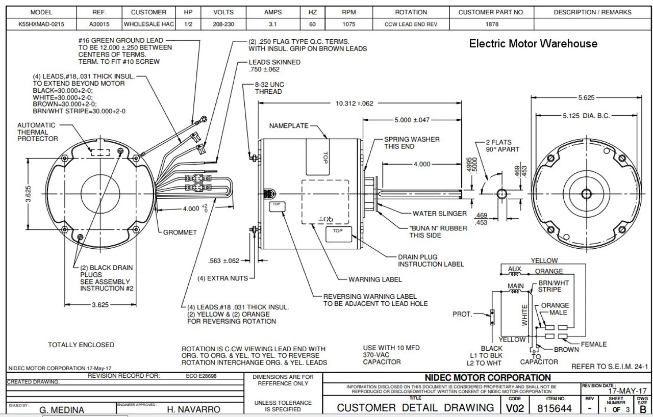 Permanent Split Capacitor Motor. Automatic Overload Protection. Continuous Duty; Totally Enclosed Air Over Enclosure; Class B Insulation; 60C Ambient Temperature; 30″ Leads, K055MAD0215012B