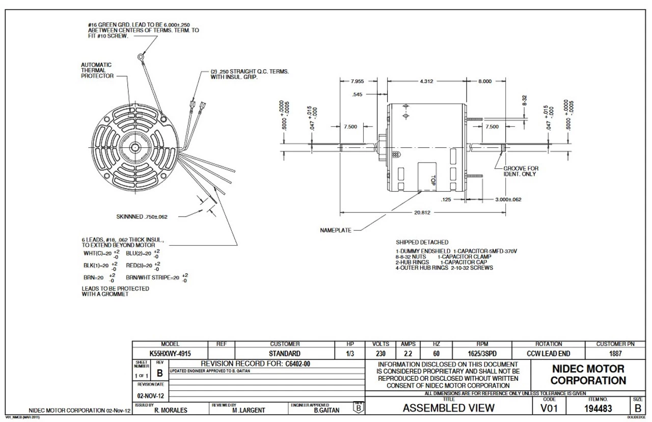 Permanent Split Capacitor Motor. Automatic Overload Protection. Continuous Duty; Open Enclosure; Class B Insulation; 40C Ambient Temperature; 20″ Leads, 60 Hertz. K0550WY4915801B.