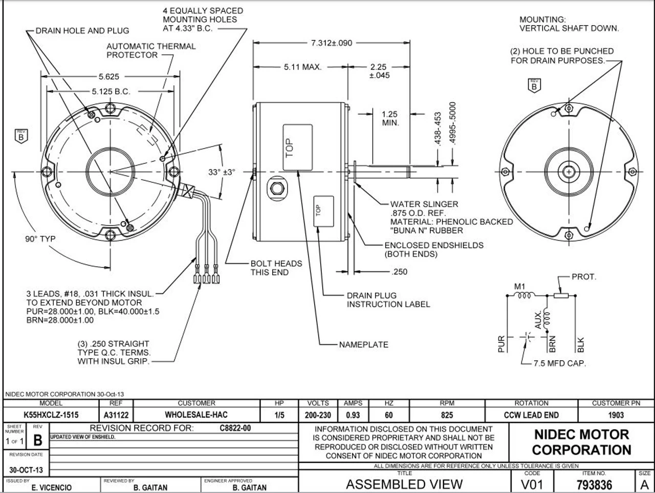 Permanent Split Capacitor Motor. Automatic Overload Protection. Continuous Duty; Totally Enclosed Air-Over Enclosure; Class B Insulation; 60C Ambient Temperature; 28″ Leads, 60 Hertz. Application: Trane A.C. Condenser fan motors. K055CLZ1515011B. Suggested aftermarket replacement for MOT13693, D156744P01