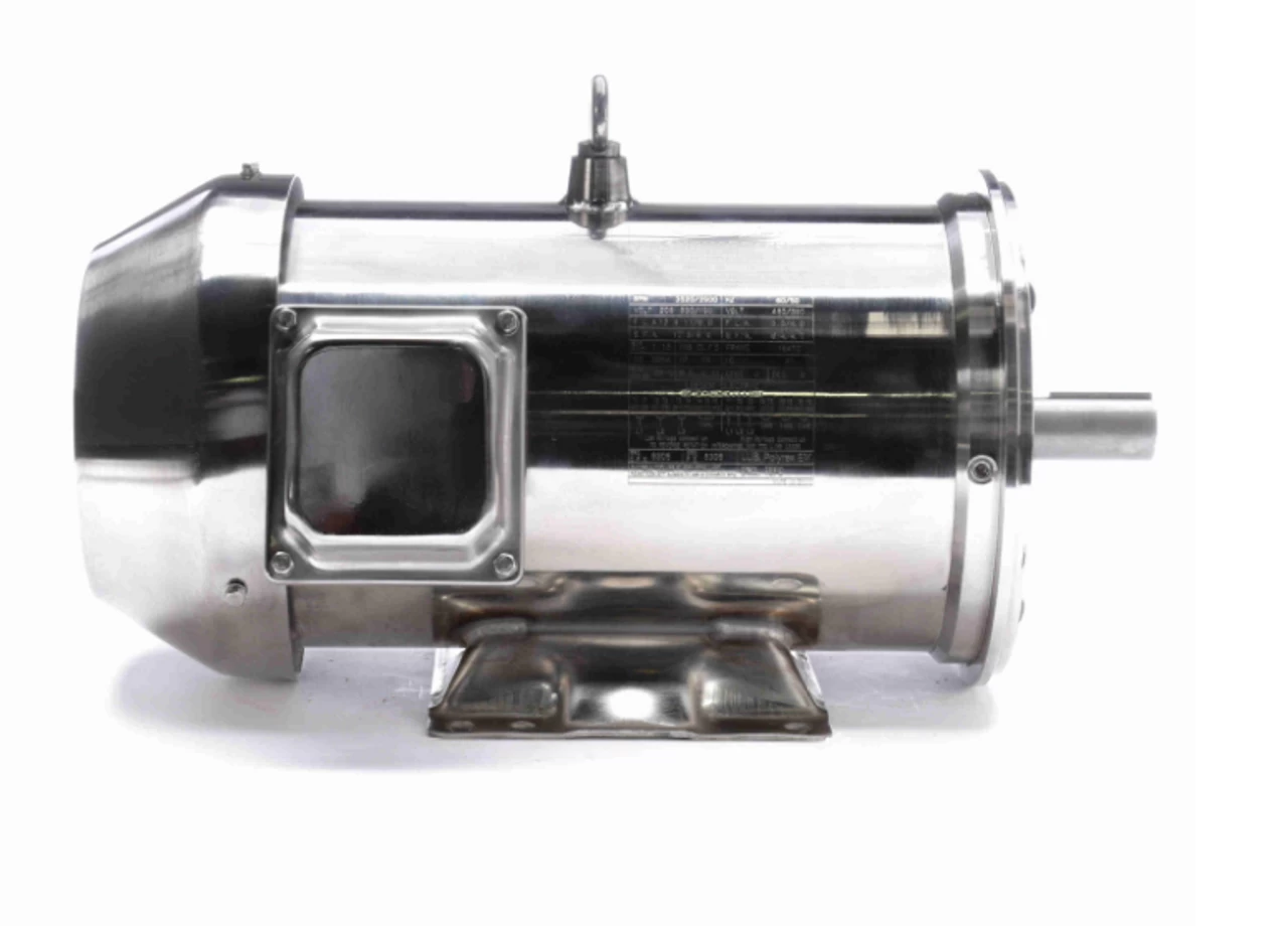 Stainless Steel wash-down motors are use in applications involving challenging caustic environments. This is a three phase electric motor with a C-face mount. Shaft has keyway. Motor has 4 threaded bolt holes on face for mounting a pump or gear head to the motor. Bolt holes are 5 7/8″ on center measured across the shaft. Wiring diagram on motor name plate. TEFC = Totally Enclosed Fan-Cooled. 194002.00