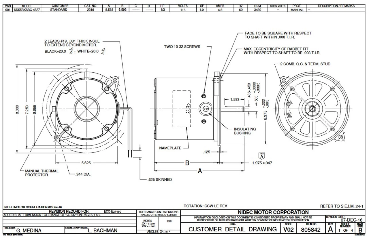 Split Phase Oil Burner Motor. Manual Overload Protection. Continuous Duty; Open Enclosure (Totally Enclosed Non-ventilated when mounted); Class B Insulation; 40C Ambient Temperature; 60 Hertz. SD55SBC4527R14B.