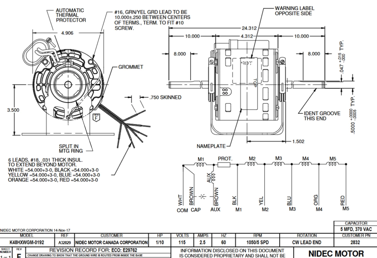 - 1/10 hp 1075 RPM, 5 speed, 2.5 amps 115V Volts 60 Hz PSC Motor