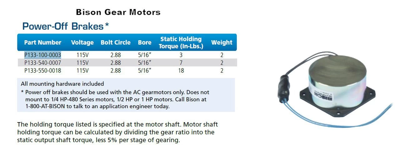 - 3 ft. pound Power off Brake for Bison AC Gear Motors 115V