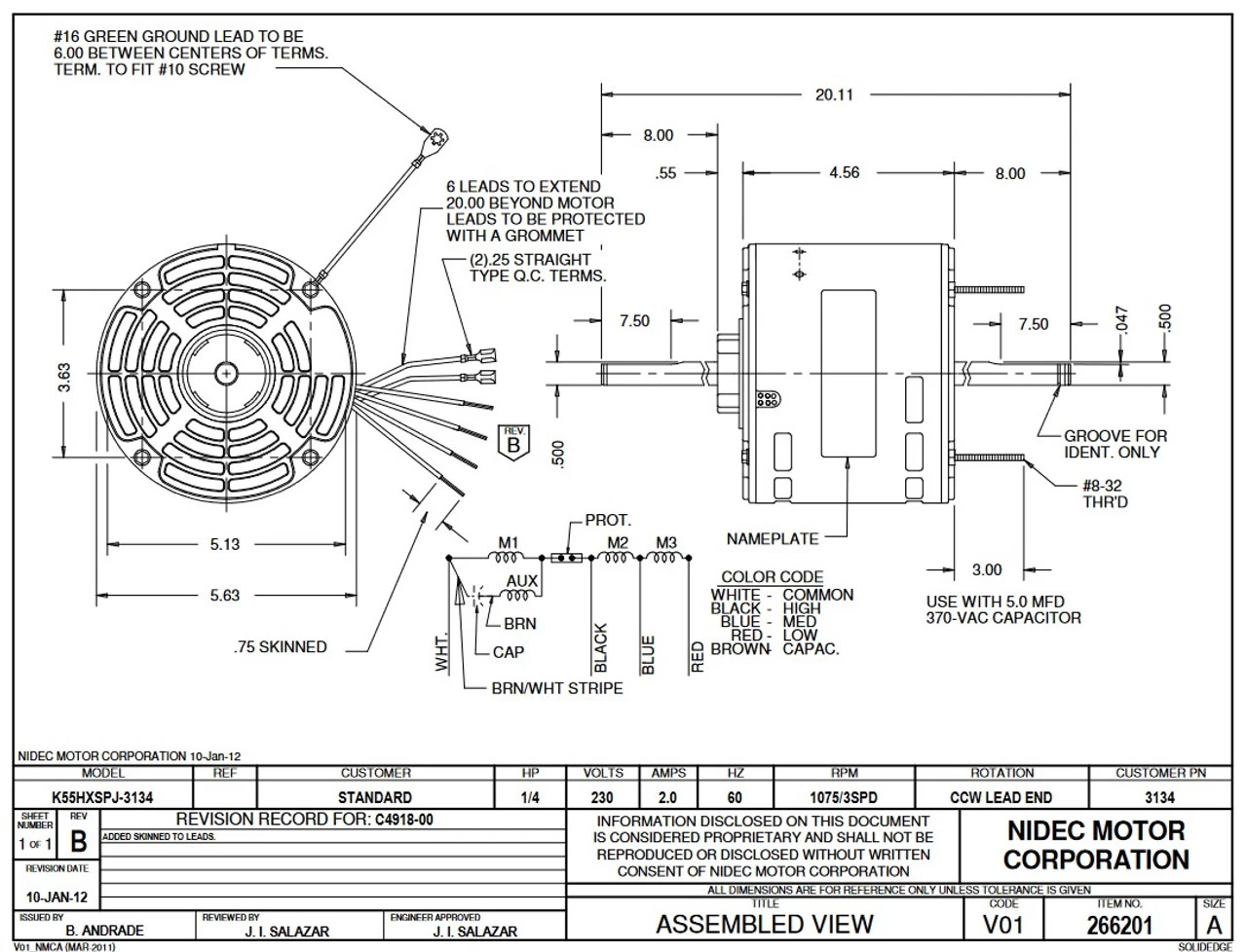 Permanent Split Capacitor Motor. Automatic Overload Protection. Continuous Duty; Open Drip Proof Enclosure; Class B Insulation; 40C Ambient Temperature; 20″ Leads, 60 Hertz. K055SPJ3134801B.