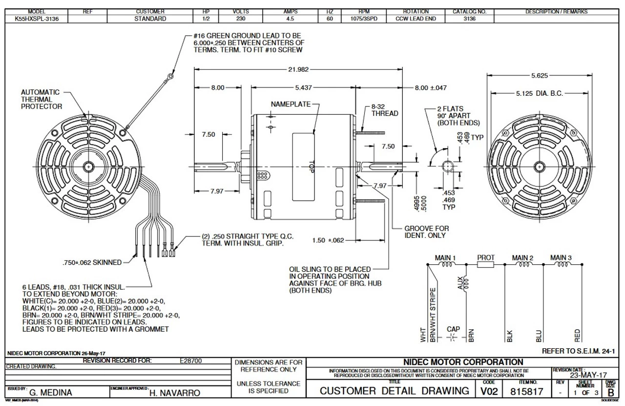 Permanent Split Capacitor Motor. Automatic Overload Protection. Continuous Duty; Open Drip Proof Enclosure; Class B Insulation; 40C Ambient Temperature; 20″ Leads, 60 Hertz. K055SPL3136801B.