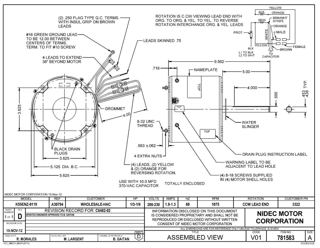 Permanent Split Capacitor Motor. Automatic Overload Protection. Continuous Duty; Totally Enclosed Air Over Enclosure; Class B Insulation; 60C Ambient Temperature; 30″ Leads, K055ENZ0119015B