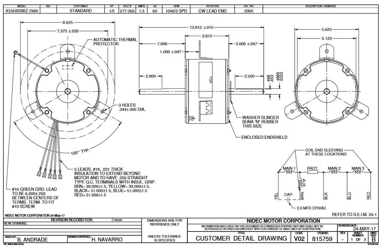 - 1/5 hp 1040 RPM 3-Speed 277-265V, 1.3 amps