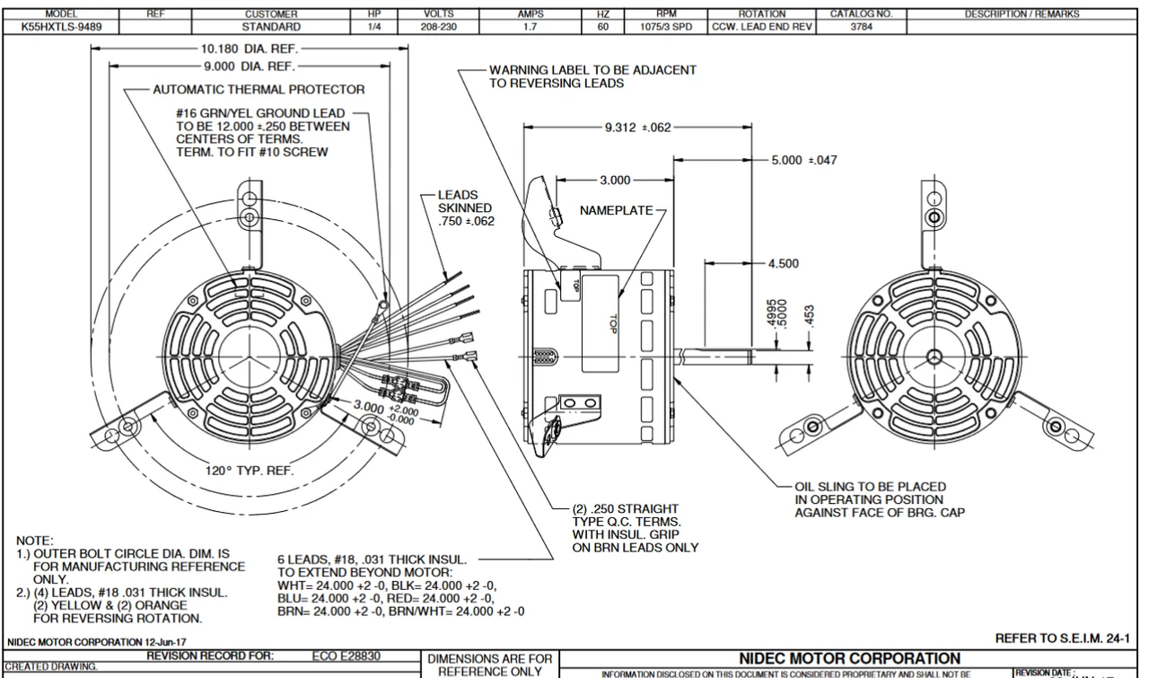 Direct Drive Fan Motor for central HVAC systems. Wiring diagram on motor name plate. OAO = Open Air Over, K055TLS9489012B