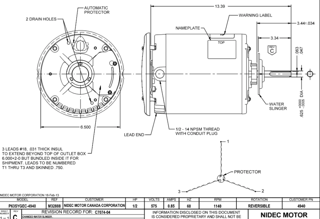 - 1/2 hp 1140 RPM, 0.85 amps 575V Volts 60 Hz 3-Phase Motor