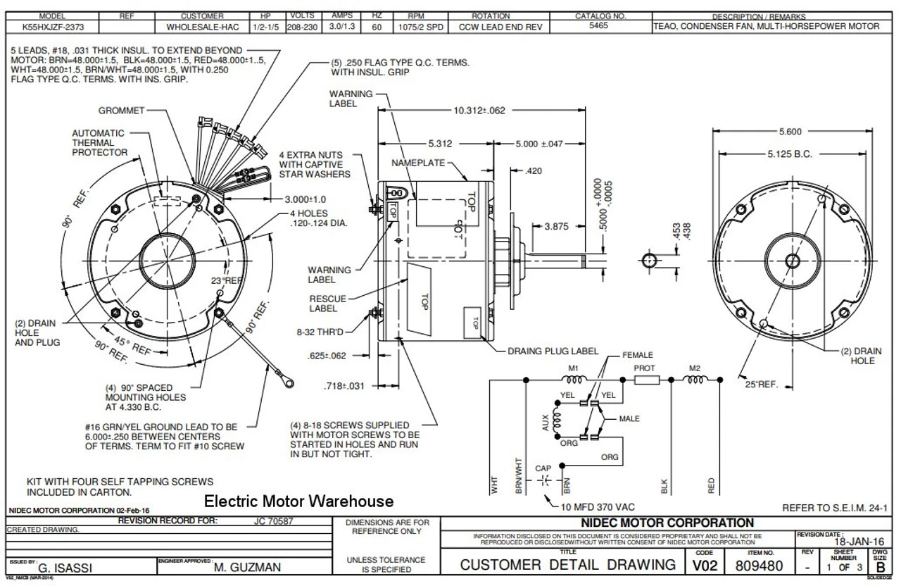 Permanent Split Capacitor Motor. Automatic Overload Protection. Continuous Duty; Totally Enclosed Air Over Enclosure; Class B Insulation; 60C Ambient Temperature; 30″ Leads, K055JZF2373012B