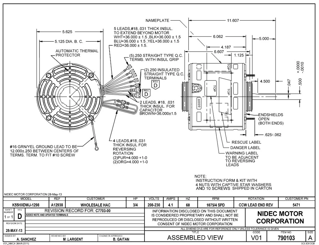 Permanent Split Capacitor Motor. Automatic Overload Protection. Continuous Duty; Open Air Over Enclosure; Class B Insulation; 40C Ambient Temperature; 36″ Leads, 60 Hertz. K055JZH2375012B. Century DL1076, Fasco D728