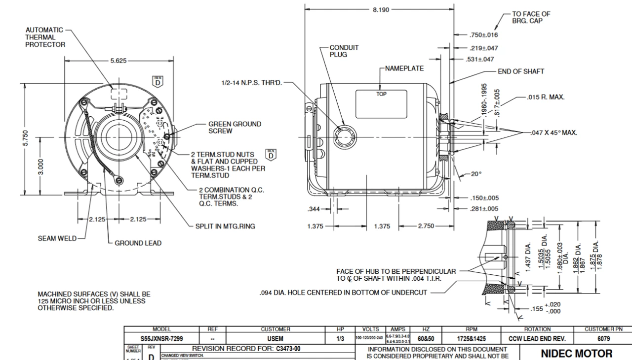 - 1/3 hp 1800 RPM, 6.4-6.3/3.0-3.1 amps 100-120/200-240 Volts 50/60 Hz Split Phase Motor