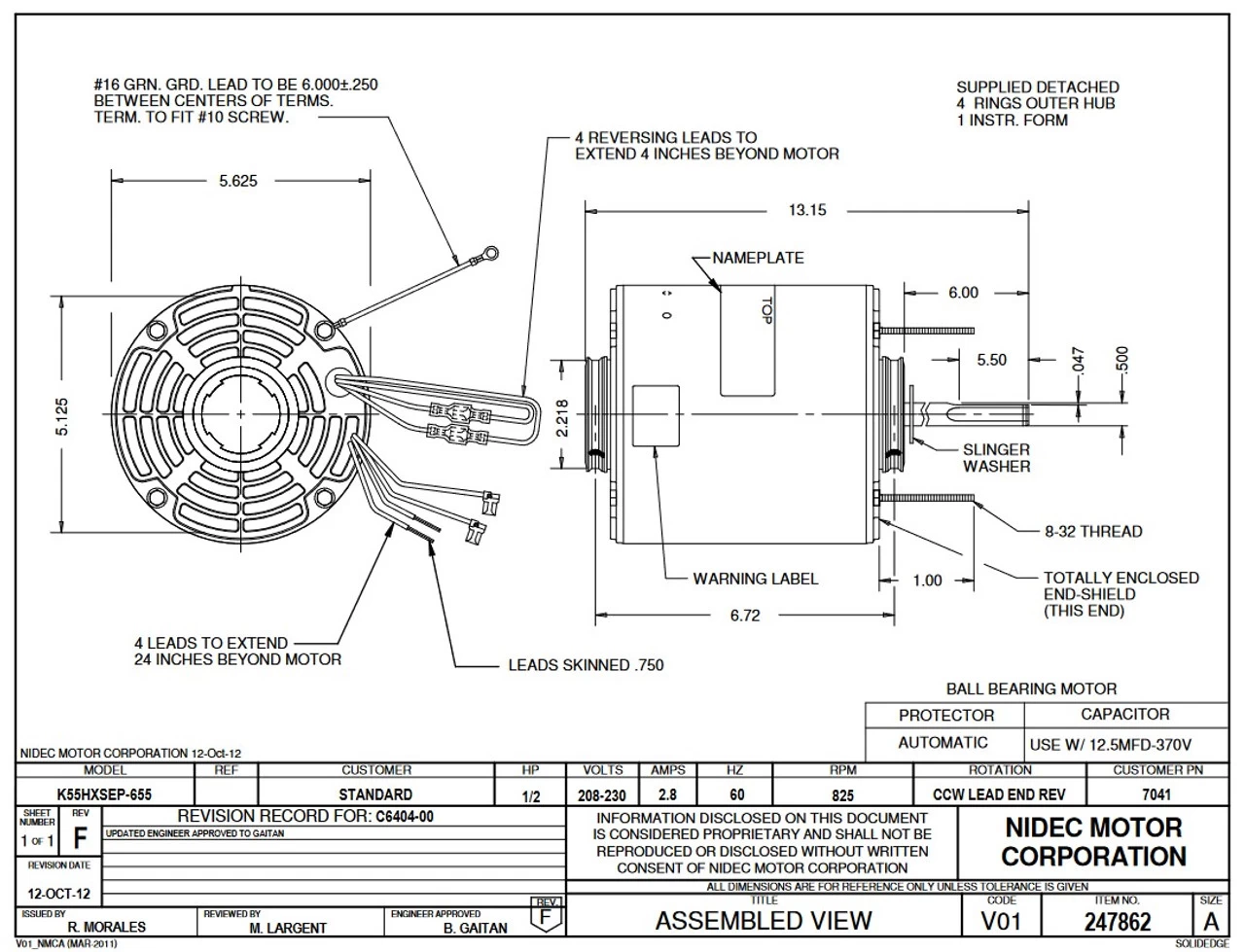 Permanent Split Capacitor Motor. Automatic Overload Protection. Continuous Duty; Open Drip-Proof Over Enclosure; Class B Insulation; 40C Ambient Temperature; 24″ Leads, K055SEP0655862B
