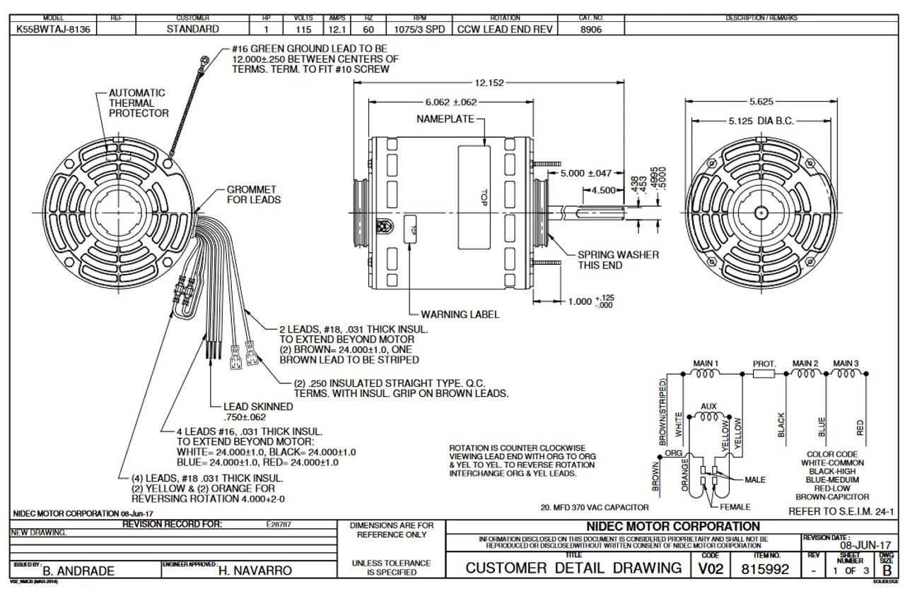Permanent Split Capacitor Motor. Automatic Overload Protection. Continuous Duty; Open Air Over Enclosure; Class B Insulation; 40C Ambient Temperature; 24″ Leads, 60 Hertz. K055TAJ8136012B. Century BDL1106