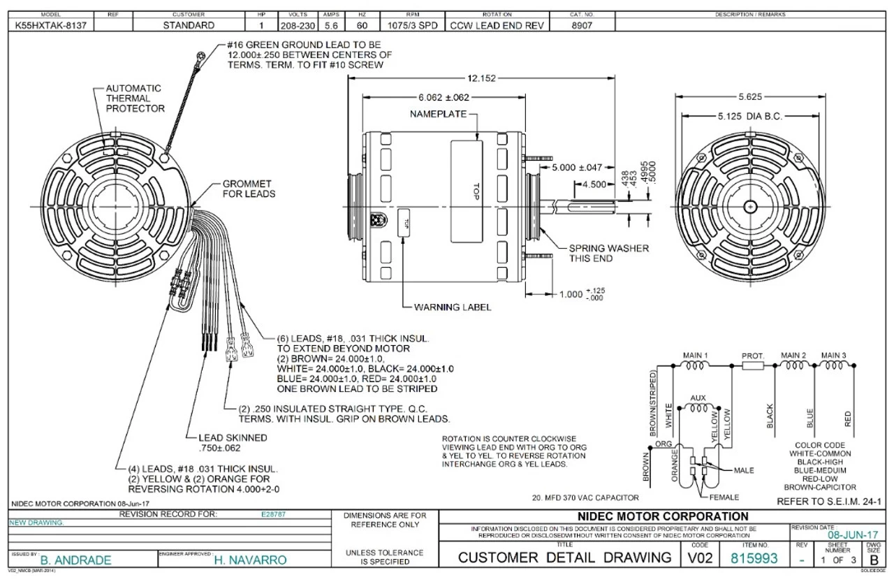 Permanent Split Capacitor Motor. Automatic Overload Protection. Continuous Duty; Open Air Over Enclosure; Class B Insulation; 40C Ambient Temperature; 24″ Leads, 60 Hertz. K055TAK8137012B. Century BDL1106