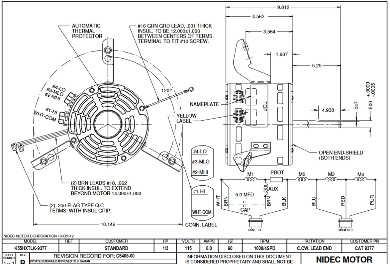 - 1/3 hp 1000 RPM (4 speed), 6.0 amps 115V Volts 60 Hz PSC Motor