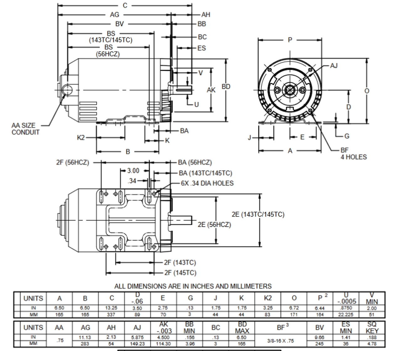 - NEMA 143TC frame Keyed Shaft 7/8″ Diameter x 2 1/4″