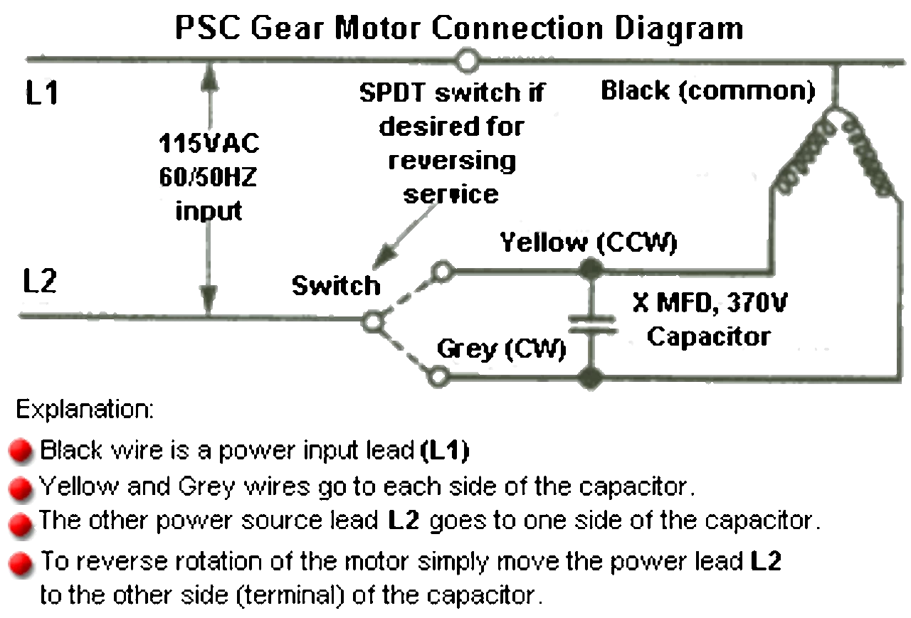 QGM-5026-1 Requires 4MFD 370 volt capacitor (included). Mounting = Output Shaft Horizontal Only. Thermal Protection = Auto