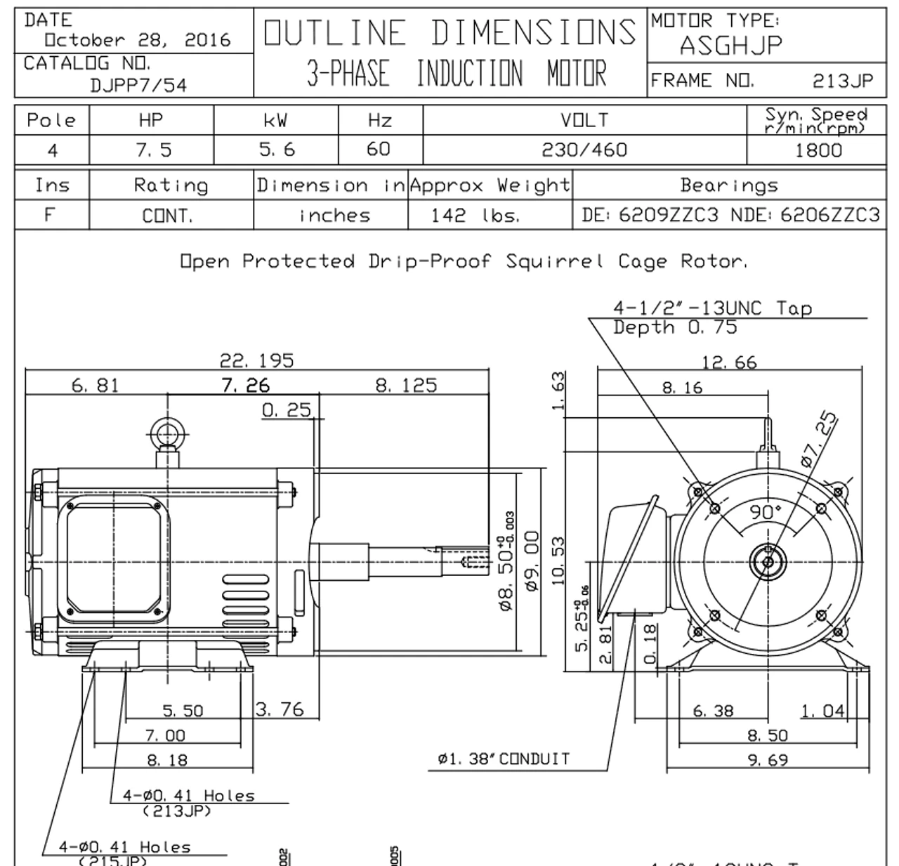 - 7 1/2 hp 1800 RPM, 19.1/9.55 amps 230/460 Volts 60hz. Three Phase