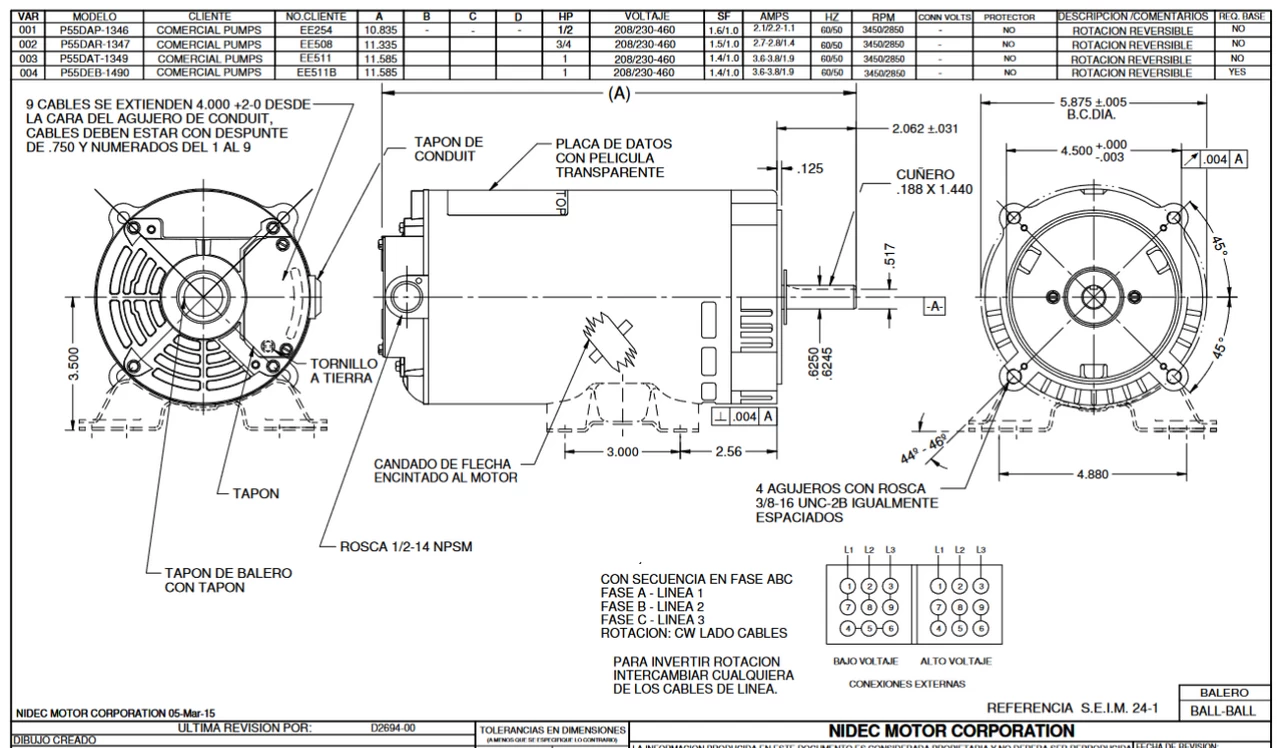Special purpose three phase C- Face motor is usually used in commercial applications involving specialized pumps. Wiring diagram on motor name plate. ODP = Open Drip-Proof. P055DAR1347015J