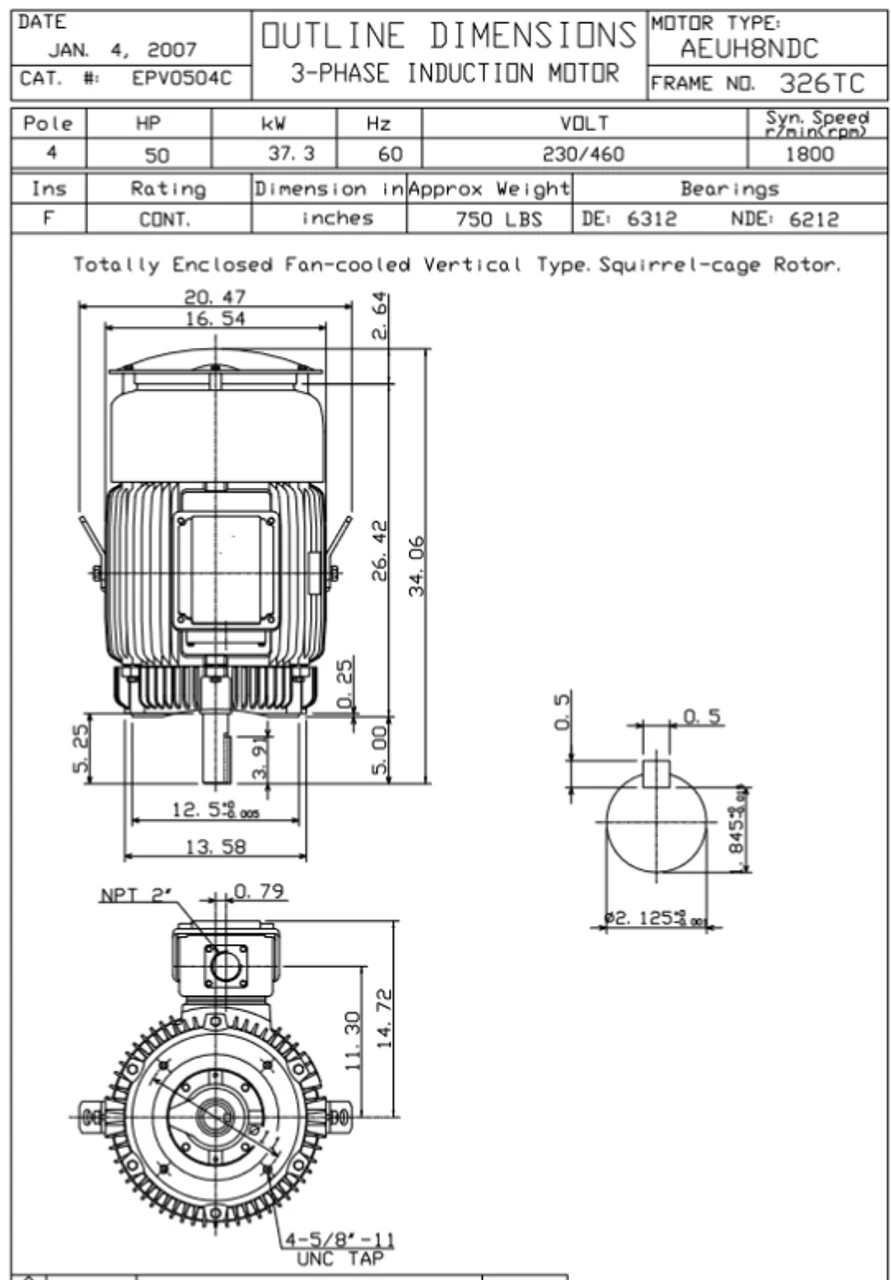 - NEMA 326TC Frame, 5 x 2 1/8″ Dia. Keyed Shaft