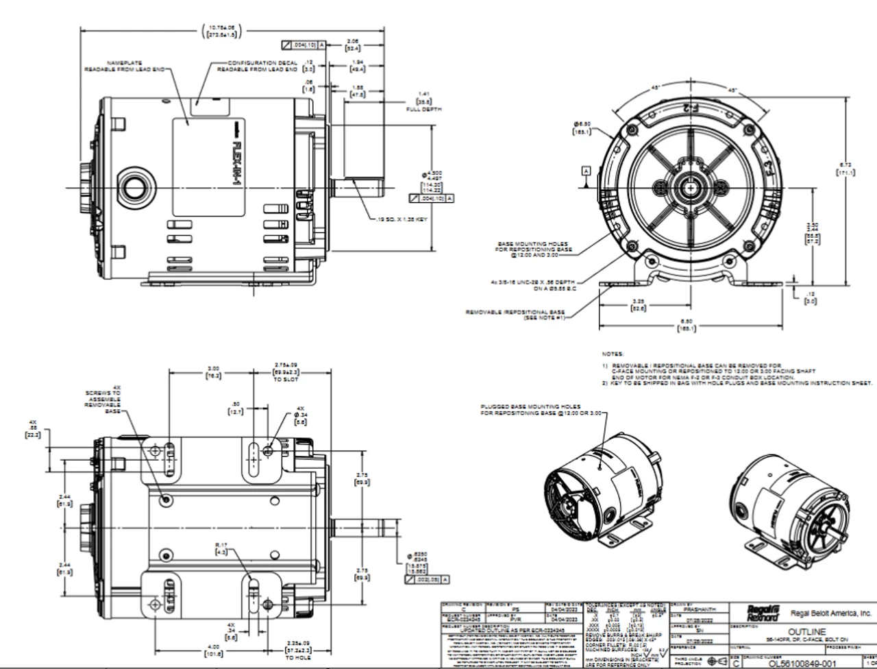 - Repositionable combination base – Holes and slots for NEMA 56, 56H, 143T and 145T mounting can be rotated for NEMA F-2 or F-3 conduit box locations (F-1 standard factory conduit box location)