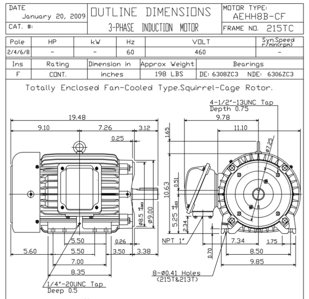 - NEMA 215TC Frame, 3 3/8 x 1 3/8″ Dia. Keyed Shaft