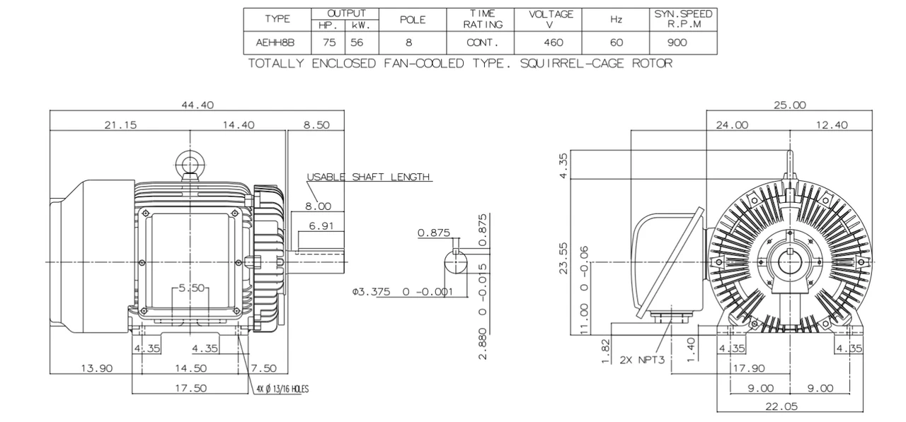 - NEMA 405T Frame, 8 1/2 x 3 3/8″ Dia. Keyed Shaft