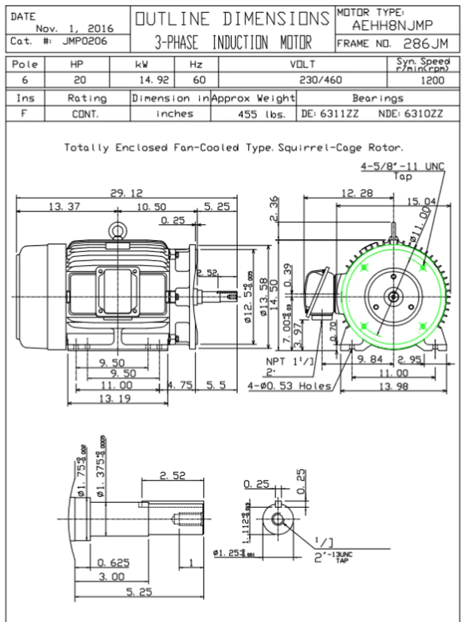 - 20 hp 1200 RPM, 48.6/24.3 amps 230/460 Volts 60Hz. Three Phase