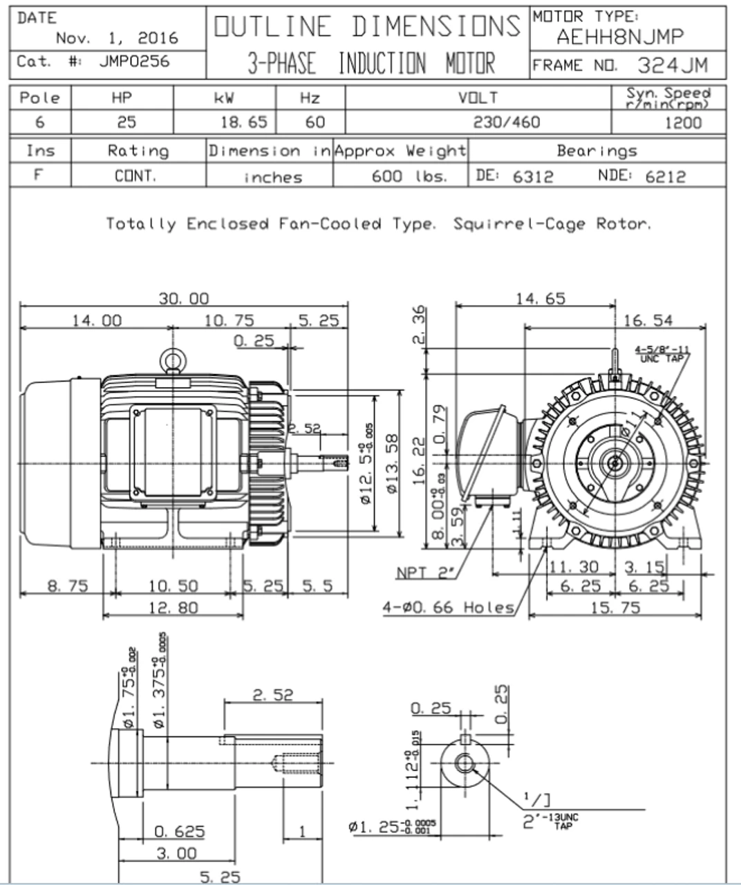 - 25 hp 1200 RPM, 60.6/30.3 amps 230/460 Volts 60Hz. Three Phase