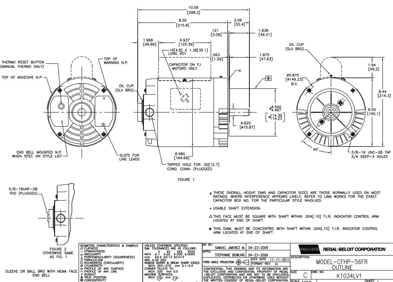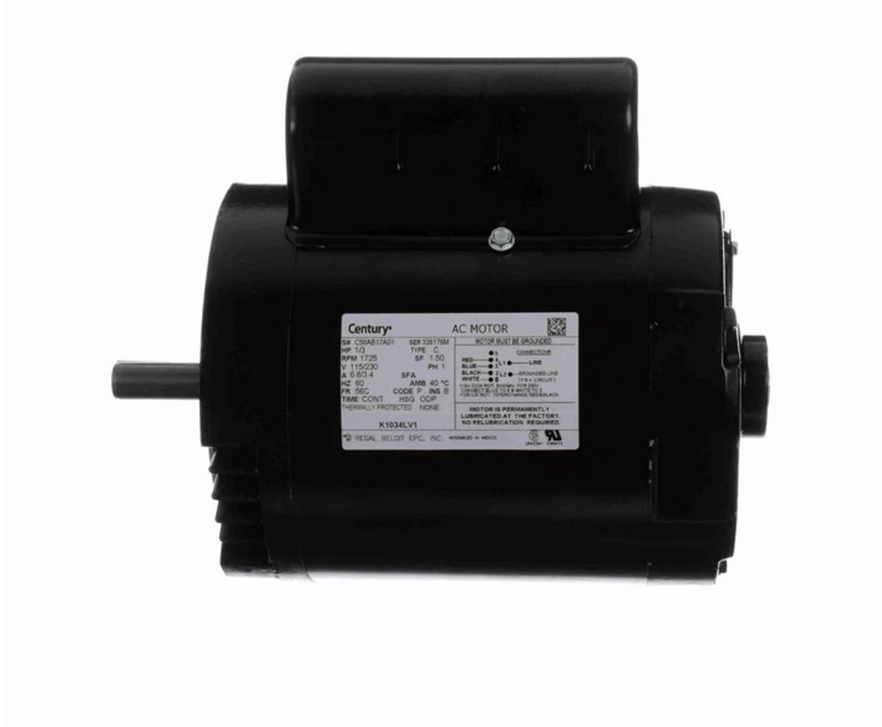 General purpose motor can be used for many applications requiring a single phase electric motor with a C-face mount. Shaft has keyway. Motor has 4 threaded bolt holes on face for mounting a pump or gear head to the motor. Bolt holes are 5 7/8″ on center measured across the shaft. Wiring diagram on motor name plate. ODP = Open Drip Proof. K1034LV1