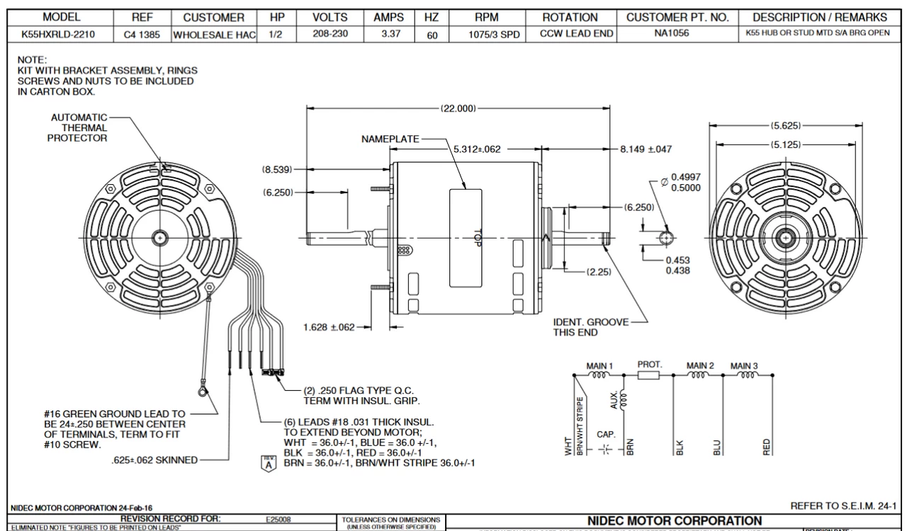 Direct Drive Fan Motor for central HVAC systems. Wiring diagram on motor name plate. OAO = Open Air-Over, K055RLD2210011B