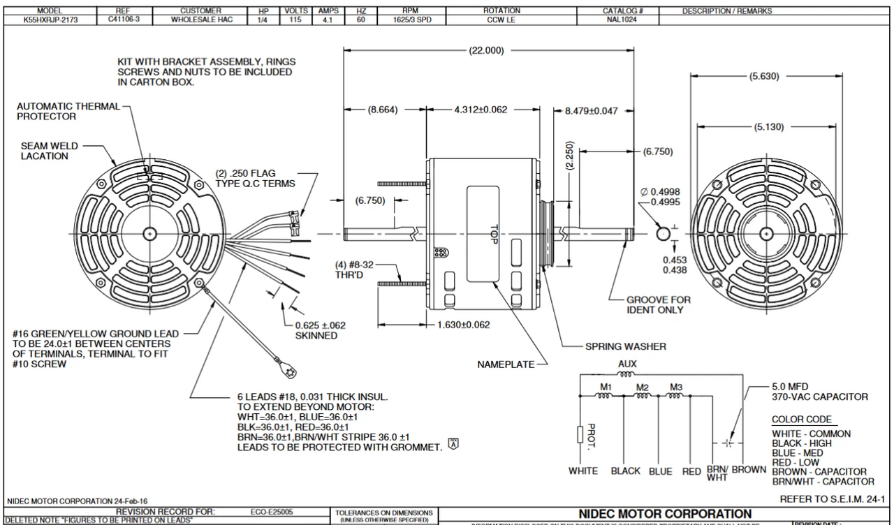 - 1/4 hp 1625 RPM, 3 speed 4.1 amps 115V Volts 60 Hz PSC Motor