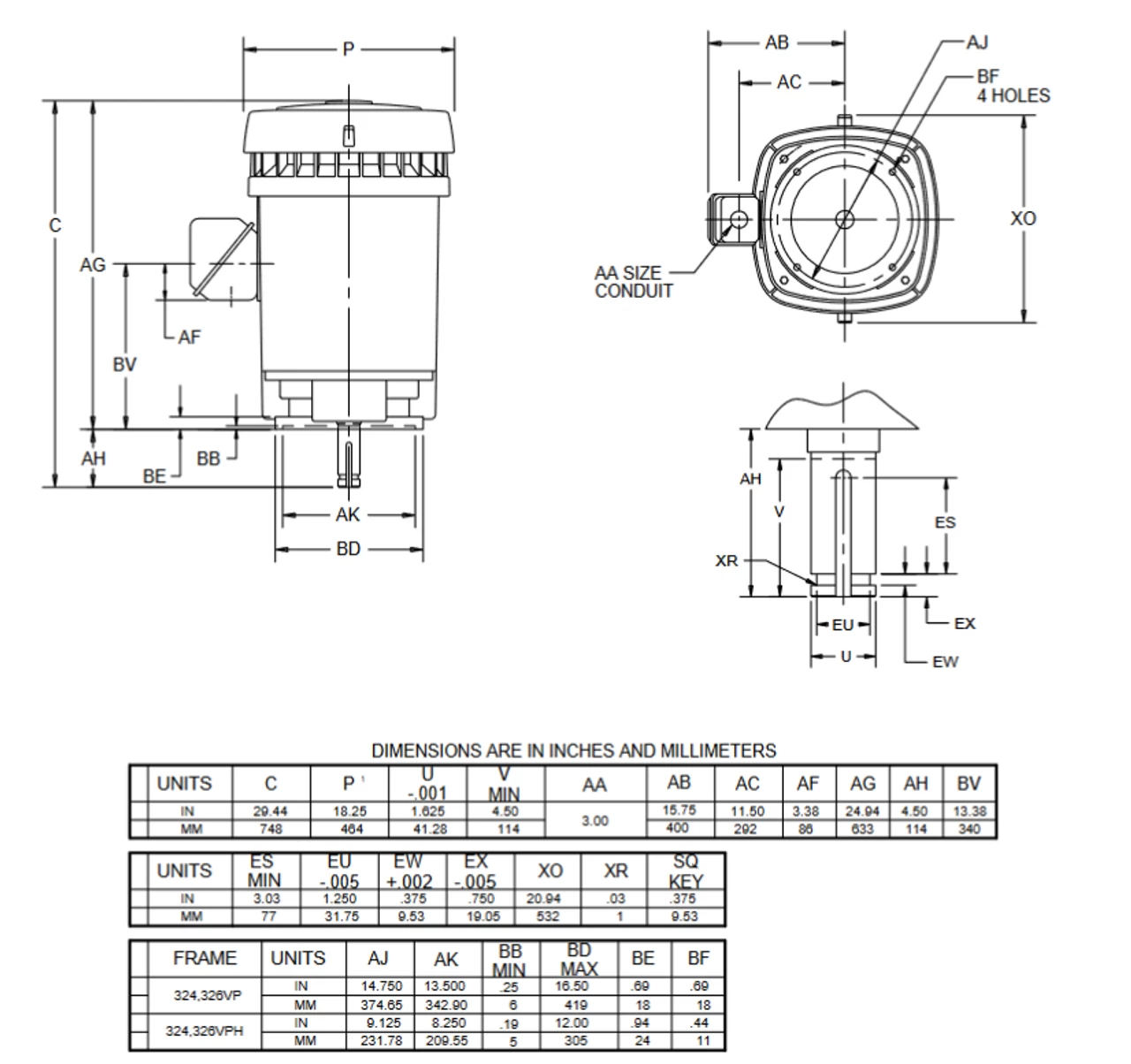 - NEMA 324VP Frame, RVS type, 16 1/2″ Dia. Base, TEFC