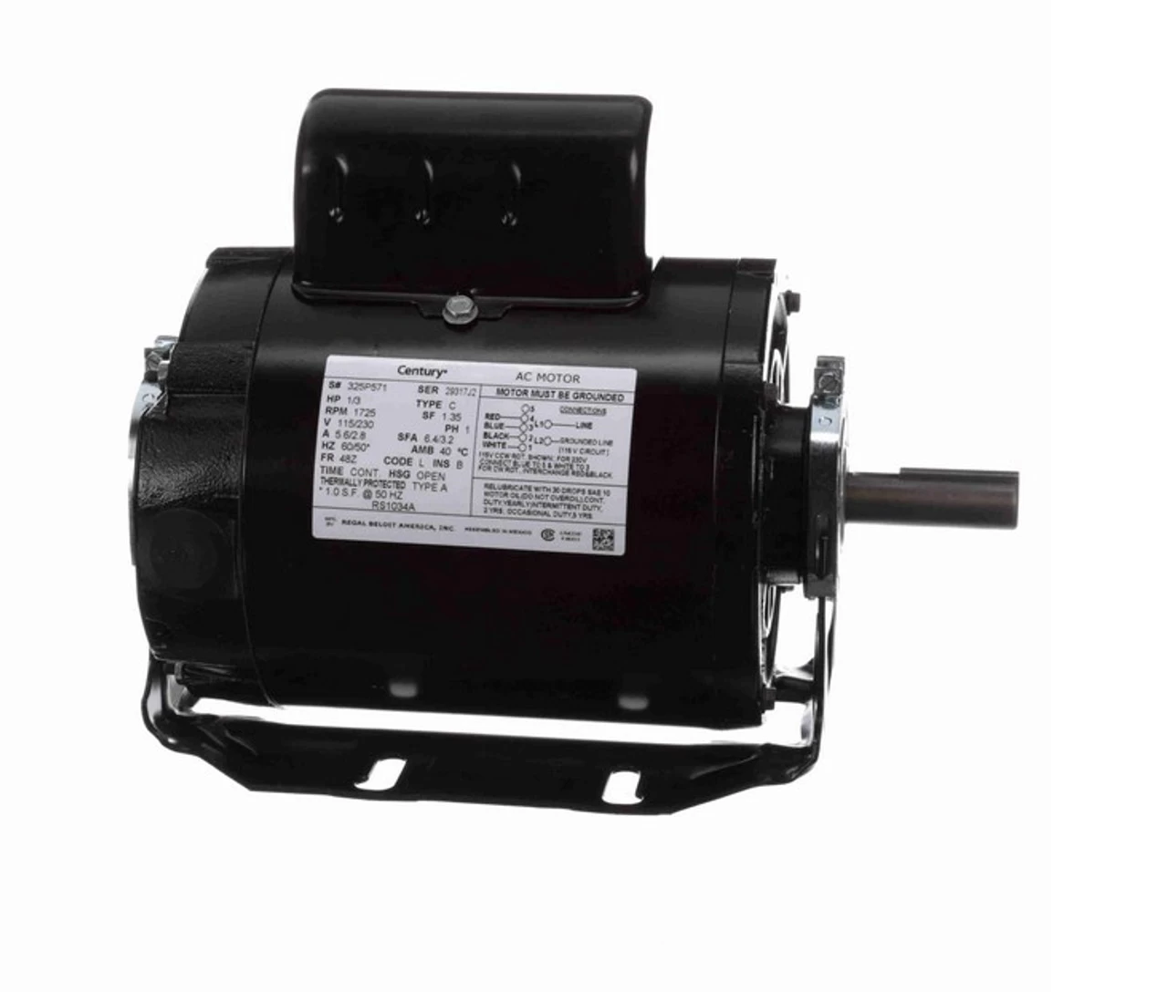 - 1/3 hp 1800 RPM, 5.6/2.8 amps, 115/230 Volts 60 Hz, Capacitor Start